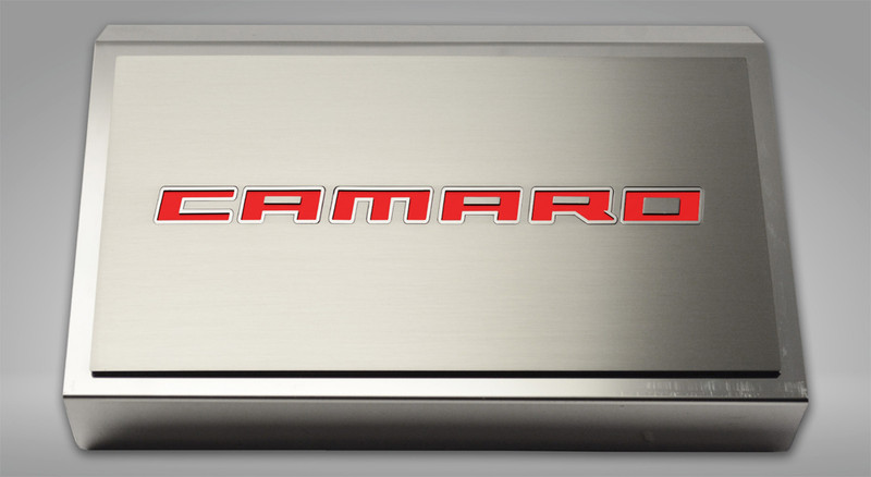Brushed Fuse Box Cover w/Bright Red "Camaro" Plate