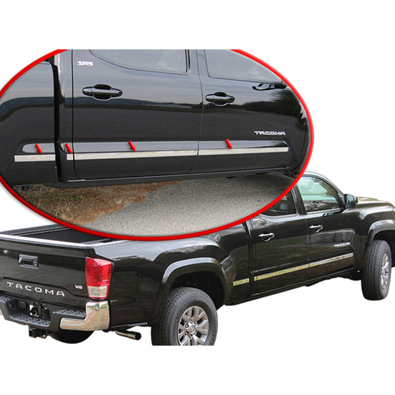 Add protection and class to your Toyota Tacoma with our Luxury FX Stainless Steel Molding Insert. Our Luxury FX items are made from the most durable 304 Stainless Steel, brilliantly polished to a mirror shine (giving it that chrome look), and are precision engineered to fit your Tacoma like it came from the factory that way! Not only do our Molding Insert pieces give you the look of luxury, but they also help protect your rockers, doors, and side panels from dings and scrapes.Installation is fast and simple: Every piece is packaged with pre-positioned Automotive Grade 3M Adhesive, ensuring that our stainless steel trim will adhere firmly for the life of your vehicle.