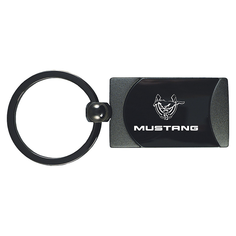 Made from high quality materials and Officially Licensed by Mustang, this item features 'Mustang' 45th Anniversary emblazoned on a Gun Metal Two-Tone Rectangular Keychain.